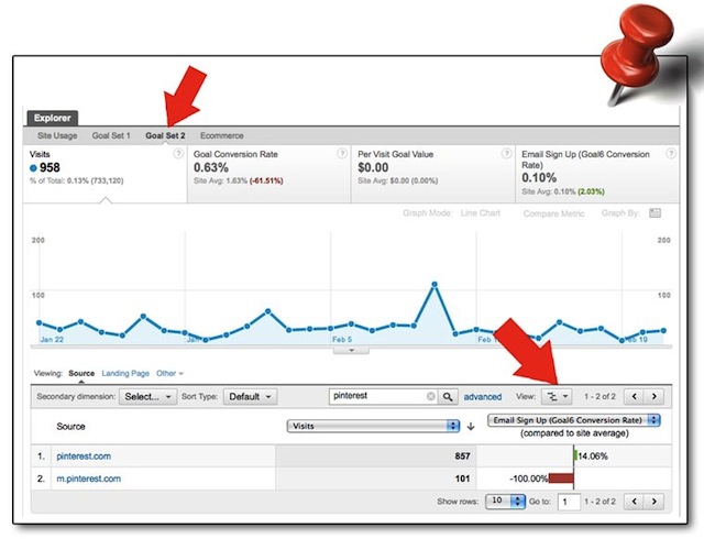 Se avete un sito di e-commerce potrete scoprire se i visitatori Pinterest sono più propensi ad acquistare, e se i loro valori medi di ordine siano superiori o inferiori rispetto ad altre fonti di traffico. Per fare questo, basta fare clic sulla scheda E-commerce (invece della scheda Set Goal) e selezionare una delle metriche di ecommerce (entrate, le transazioni, il valore medio, tasso di conversione e-commerce o di valore per visita).