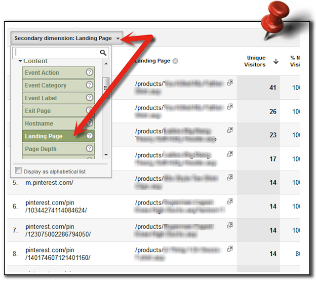 Adesso analizziamo una Landing Page (come una secondary dimension). Sappiamo quali sono le immagini (cioè i prodotti) del nostro sito che invogliano la gente a passare da Pinterest al sito stesso.