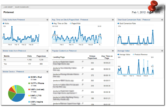 Durante la tracciabilità di Pinterest, è bene monitorare diverse aree chiave: visite giornaliere da Pinterest, quante di queste visite proviene da dispositivi mobili, quanto tempo rimangono sulle pagine e quante pagine guardano, i contenuti più popolari, e se i “pinners” stanno completando i nostri obiettivi e stanno acquistando i nostri prodotti.