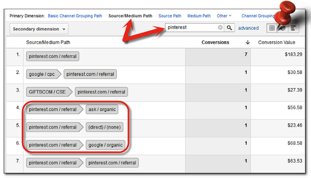 Quindi, per vedere come Pinterest e altre fonti di traffico si mescolano prima della conversione definitiva, non ci rimane che vedere il report Top Conversion Paths (vedi sopra). Anche in questo caso, selezionare Source / Media Path come dimensione primaria e filtro per Pinterest. Ora, è possibile vedere i casi in cui Pinterest ha generato il traffico, gli utenti che hanno restituito qualche tempo dopo e convertito.