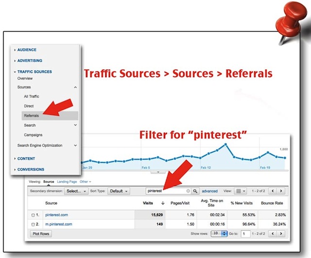 Vai a Sorgenti di traffico> Fonti> Referenti report. Da lì, se non vedete pinterest.com (o m.pinterest.com) nei primi 10 referrals, cercare “pinterest” utilizzando il filtro nella parte superiore della tabella.