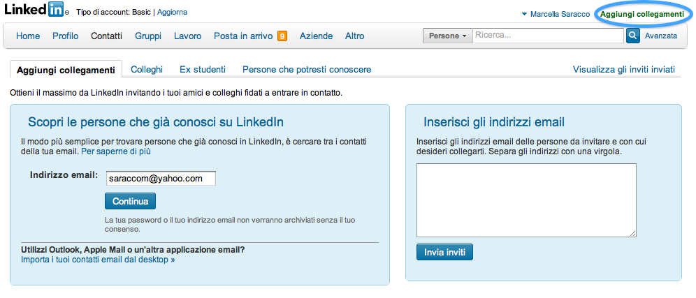 Una volta completato il profilo, bisogna creare una solida rete di connessioni. Dal momento che LinkedIn è un database, più saranno le connessioni, maggiori saranno le possibilità di essere contattati dagli utenti di 2 ° grado e viceversa. È sufficiente selezionare “Aggiungi Collegamenti”, dalla tendina Contatti, e caricare il database di posta elettronica. È inoltre possibile cercare colleghi o ex allievi in base a dove sia ha lavorato o si è andati a scuola. Assicuratevi di inviare l’invito a coloro che veramente conoscete. Ad esempio: