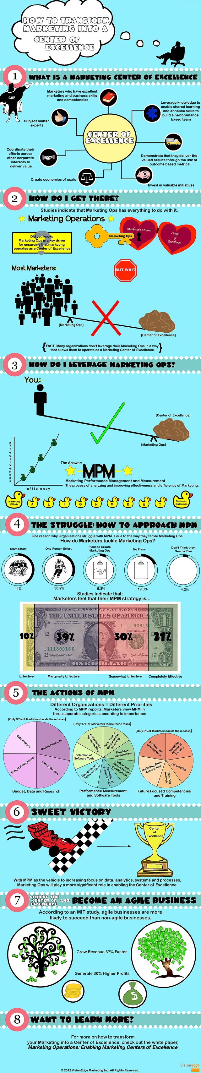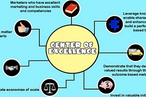 Un centro di eccellenza è costituito da esperti in materia e si avvale di metodologie e strumenti che consentano l’apprendimento condiviso e favoriscano la costruzione di una performance basata sul team. Usando i risultati basati su metriche, un centro di eccellenza giustifica il team di marketing.