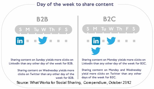La condivisione via LinkedIn di contenuti B2B è più efficace di Domenica, mentre il Lunedi è il giorno più efficace della settimana per la condivisione di contenuti B2C. Per quanto riguarda Twitter invece, la condivisione B2B è più efficace se capita di Mercoledì, mentre la condivisione di tweet B2C, rende meglio se fatta di lunedì e mercoledì.