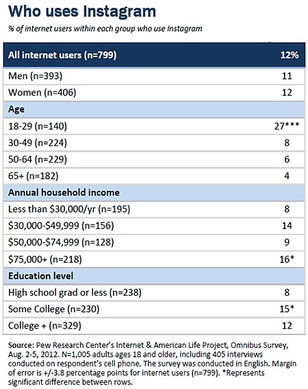 Anche gli utenti di Instagram sono maggiormente di età giovane – il 27% è di età 18-29. Il servizio di condivisione foto costruito intorno ad un app smartphone che permette agli utenti di usare filtri o tinte per modificare le foto scattate per poi condividerle in rete viene usato dal 12% degli adulti online.