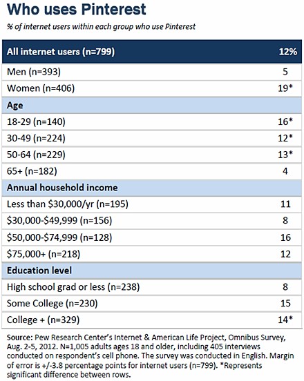 I giovani sono i più attivi su Instagram e Tumbler, mentre le donne (19%) sono più propense degli uomini (5%) a usare Pinterest un sito che permette agli utenti di organizzare e condividere contenuti provenienti da tutto il Web “pinning”, foto e immagini in “bacheche” che vengono organizzati per categoria o per tema: