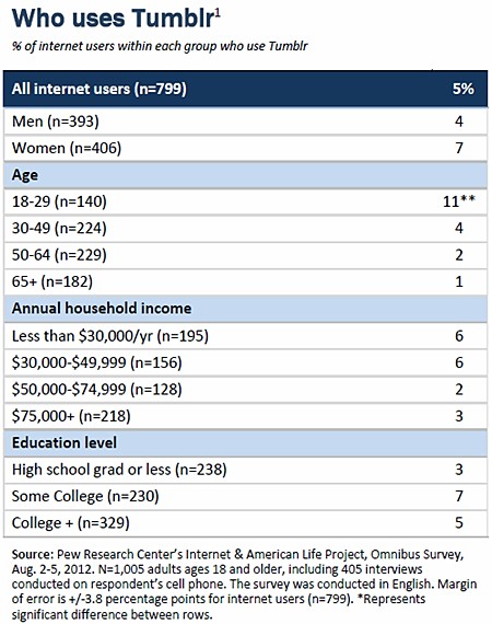 Il 5% degli adulti online usa Tumblr, di cui 11% è di età 18-29, generalmente di basso reddito.