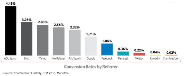 Il report Ecommerce Quarterly (EQ), che ha analizzato un campione di oltre 500 milioni di esperienze di shopping on-line nel 1° trimestre 2013, ha trovato che i social media hanno rappresentato solo 1,55% di tutto il traffico e-commerce verso i migliori siti, lontano dai dati raccolti dai motori di ricerca (31,43%) e dalle email (2,82%). Inoltre, le piattaforme complessive di social media hanno avuto un tasso di conversione del 0,71%.