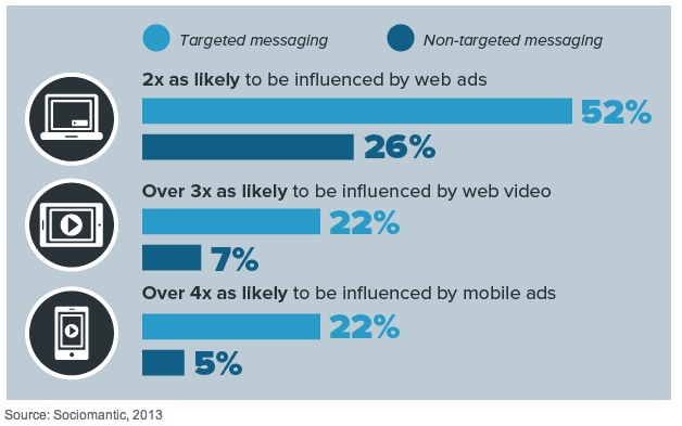 - Gli intervistati dicono che il loro comportamento d’acquisto on-line è influenzato di circa due volte a seguito di annunci sul web mirati (52%) rispetto agli annunci non mirati (26%).