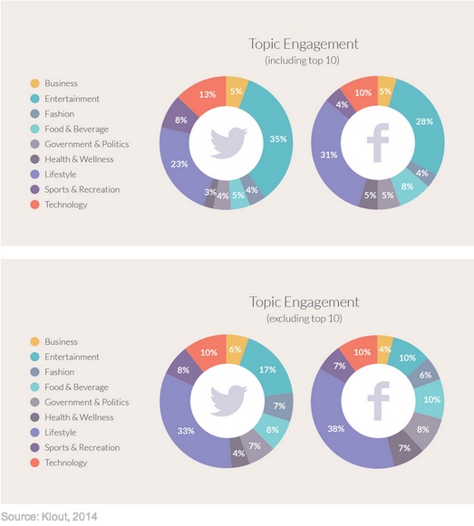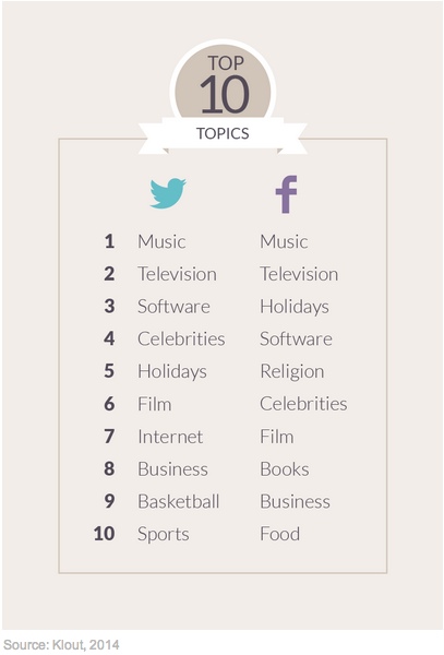 Allora andiamo a vedere i dati forniti da un recente studio condotto da Klout. I 10 più popolari argomenti contenuti su Facebook e Twitter sono molto simili, ma gli argomenti differiscono significativamente oltre la top 10.