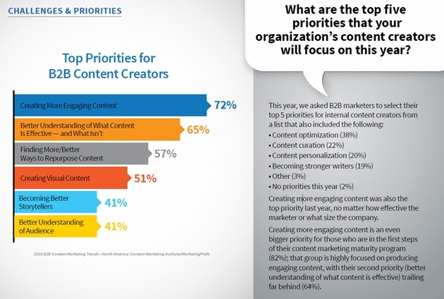 Quali sono quindi le priorità per il futuro? La creazione di contenuti accattivanti (72%), una miglior comprensione di qui siano i contenuti efficaci e quali no (65%), e solo il 41% vuole affinare lo storytelling.