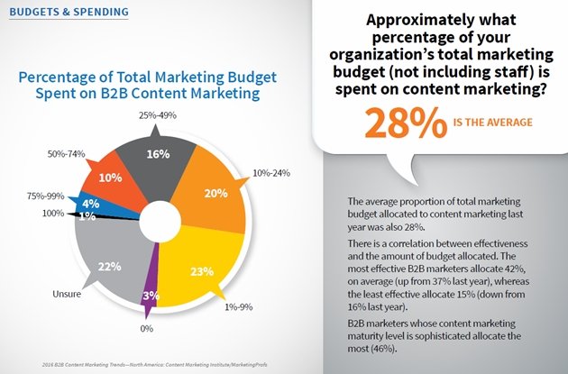 Bilancio: Il marketing B2B più efficace destina in media il 42% del bilancio totale nel marketing, nelle aziende con il marketing dei contenuti più sofisticato / maturo viene destinato il 46%. La media per tutti i marketing B2B è del 28% (come l’anno scorso).