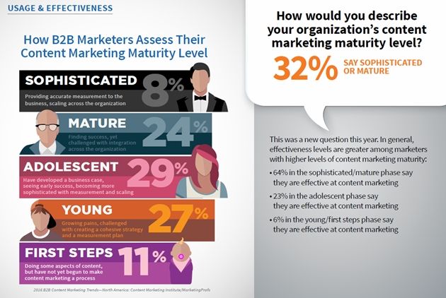 Esperienza: In generale, i marketers diventano più efficaci man mano che acquisiscono esperienza. Livelli di maturità dei contenuti dei marketing intervistati, sono stati più o meno equamente ripartiti: circa un terzo erano nelle prime fasi; un terzo, nella fase adolescenziale; e un terzo, nella fase sofisticata / matura.