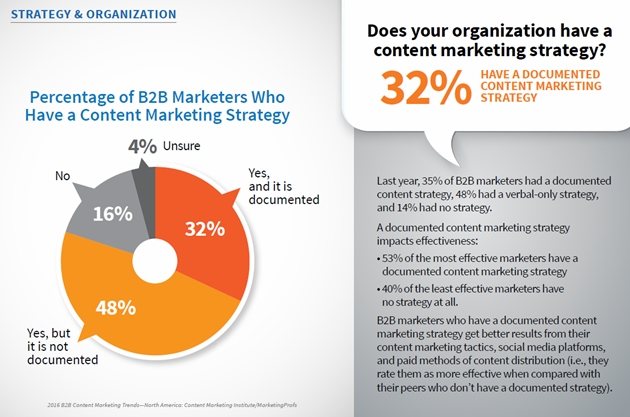 Documentazione: i marketing di contenuti B2B che documentano la loro strategia sono più efficaci. Seppur rimangano sempre pochi quelli che utilizzano questa pratica (32% vs. 35% dello scorso anno).