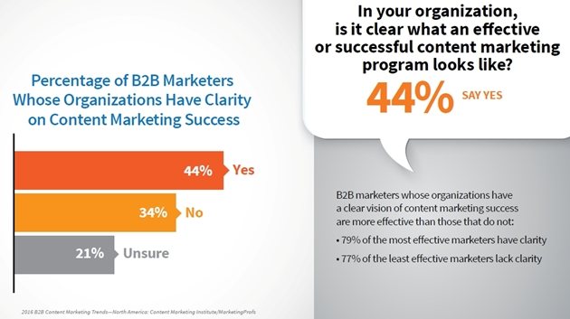 Solo il 44% dei marketers B2B afferma che nella loro organizzazione è chiaro cosa significa un programma di contenuti di marketing efficaci e di successo. Ovviamente queste aziende avranno maggior successo di riuscita.